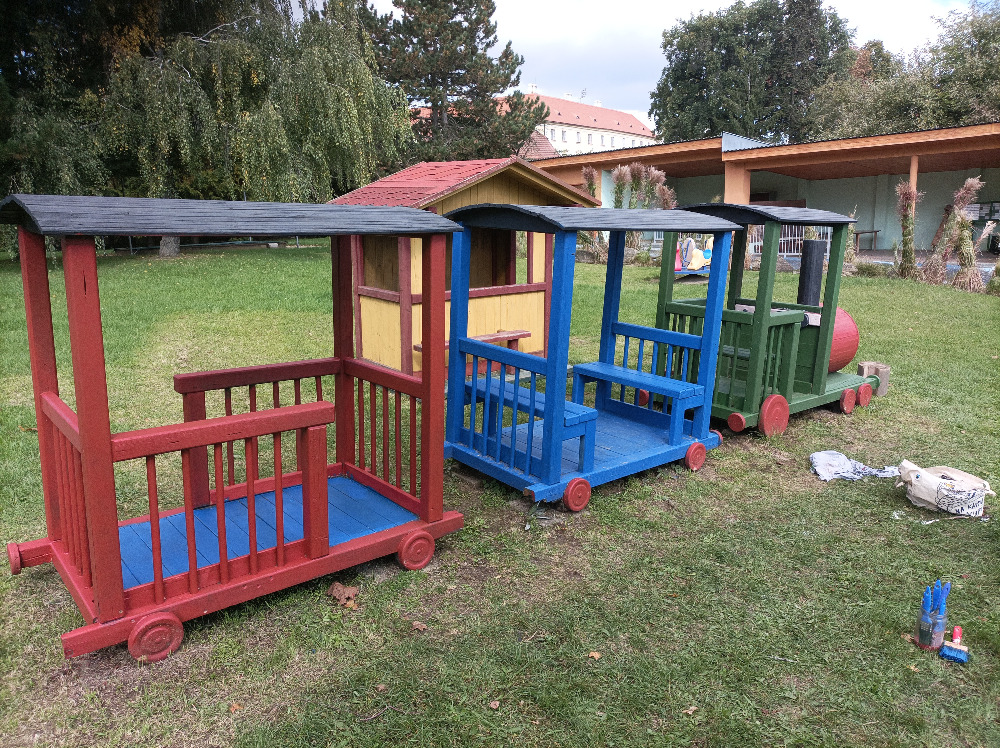 Žáci Pč 8. a 9. tř. opravili vláček v areálu školky pro děti. Jednalo se hlavně o povrchovou úpravu. Rekonstrukce byla úspěšná, jak dokládají fotografie.